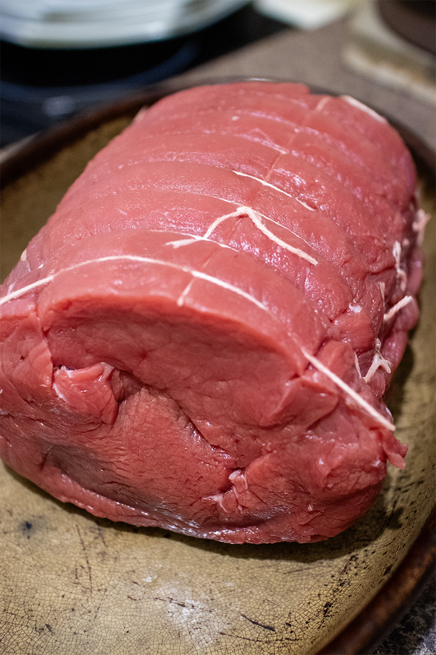 ↑焼く前。今回もボンマルシェ食品館の精肉コーナーで買い求めた牛フィレ塊、1kg強。大きめの方が焼きやすいし、余れば翌日も楽しめるので「4人分で」と伝えたら、担当の人がナイフを塊に当てて「1、2、3、4」と巨人の歩幅で計ってこうなった。たしか過去には、4人なら600gだと言われたこともあるので、人によって感覚がだいぶ違う。