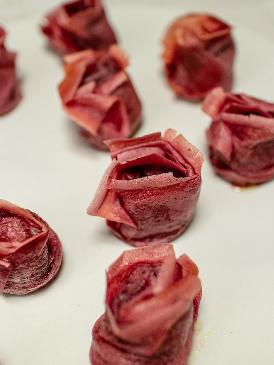 シャンパーニュを開けて、ここ数年気に入っているピカールの薔薇の形のアペリティフをつまむ。