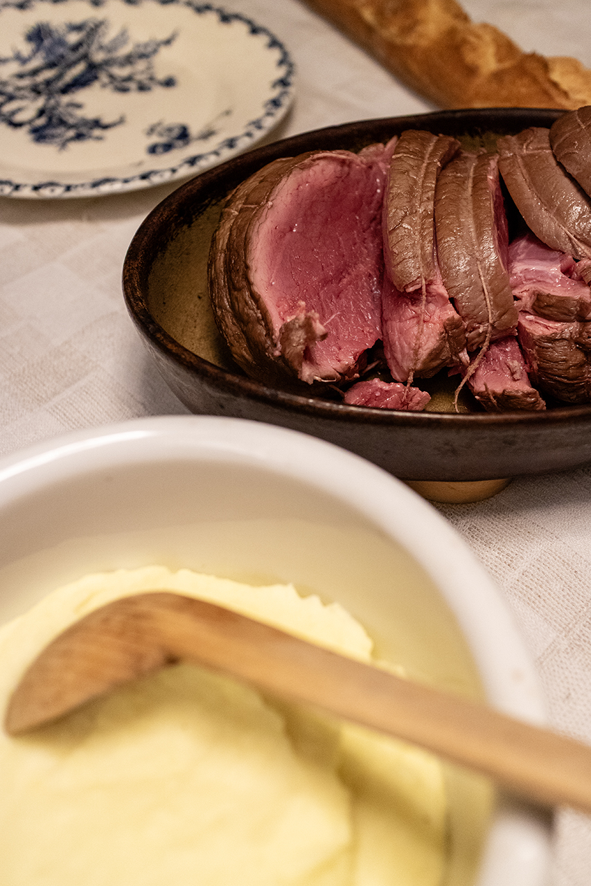 3人の会になった場合に備えてあったフォアグラは出さず(薔薇のアペリティフの中にもフォアグラ入ってるし)、さっさとメインの牛肉ローストを出す。2人のクリスマスディナーはスピードがはやい。シャンパーニュもセルフサービスでどんどん減っていく。