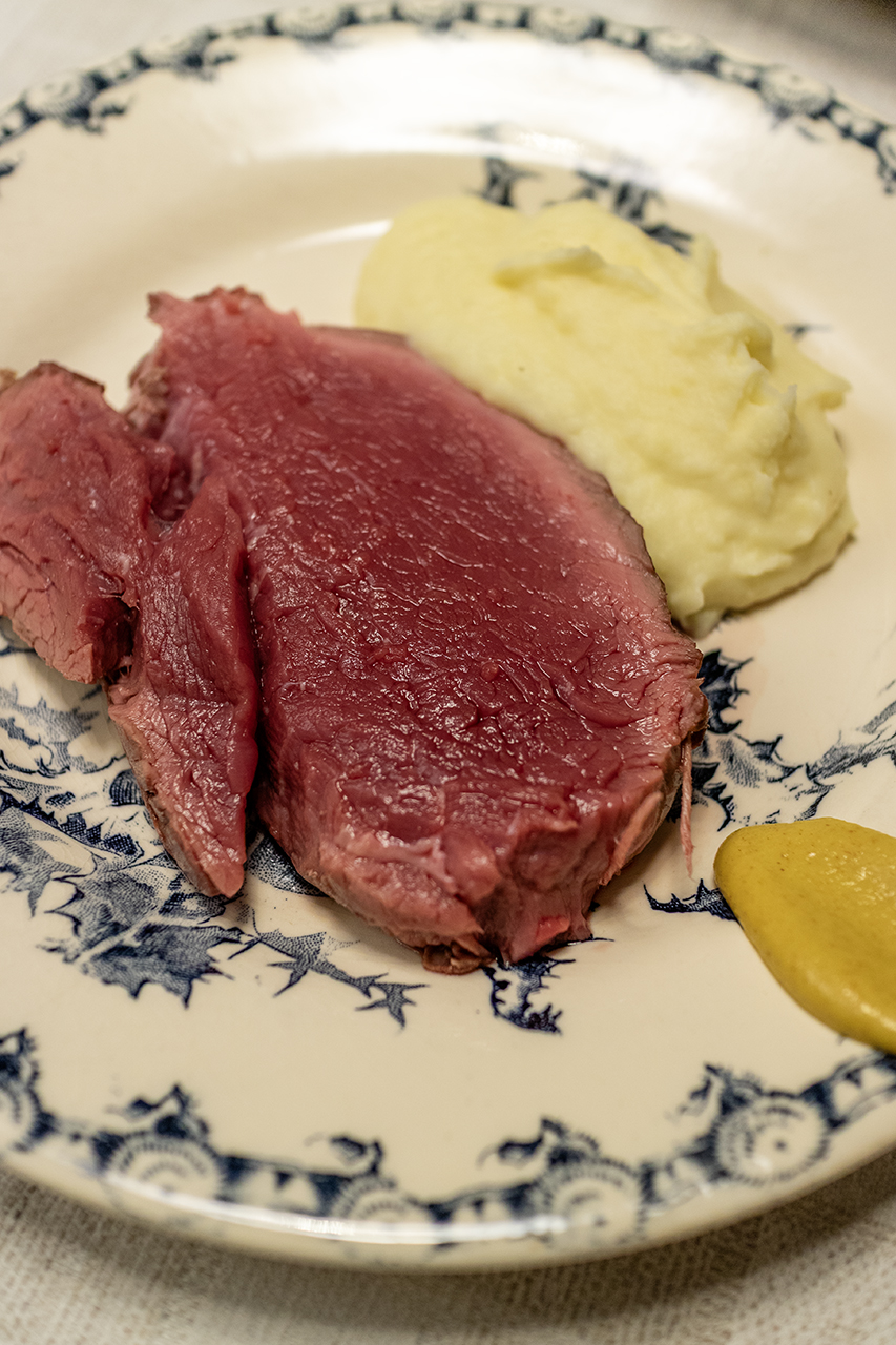 味は最高。開封したてのマスタードと、芋のピュレを添える。夫は2切れも食べてしまった。